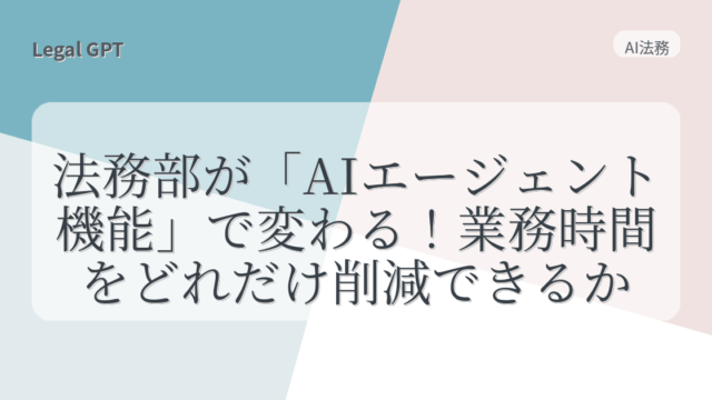 AI法務 法務部が「AIエージェント機能」で変わる!業務時間をどれだけ削減できるか? 2025年8月6日 fujita_admin https://legal-gpt.com/wp-content/uploads/2025/06/9cfed54331b16c43d320b81fc65f5b29.png Legal GPT