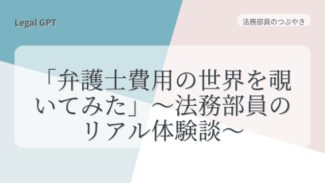 法務部員のつぶやき 「弁護士費用の世界を覗いてみた」〜法務部員のリアル体験談〜 2025年8月7日 fujita_admin https://legal-gpt.com/wp-content/uploads/2025/06/9cfed54331b16c43d320b81fc65f5b29.png Legal GPT