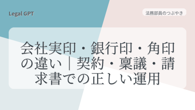 法務部員のつぶやき 会社実印・銀行印・角印の違い|契約・稟議・請求書での正しい運用 2025年9月12日 fujita_admin https://legal-gpt.com/wp-content/uploads/2025/06/9cfed54331b16c43d320b81fc65f5b29.png Legal GPT