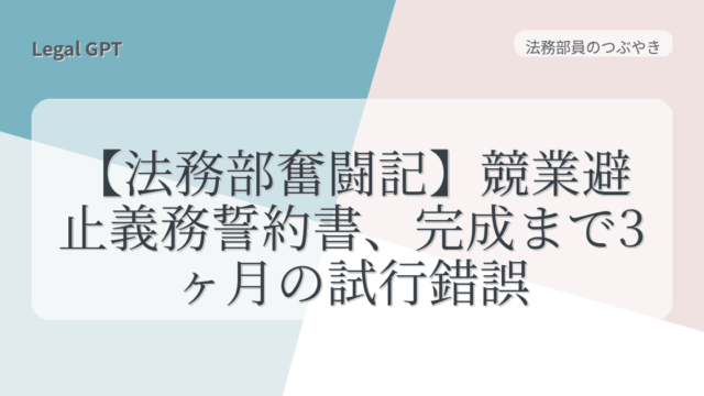 法務部員のつぶやき 【法務部奮闘記】競業避止義務誓約書、完成まで3ヶ月の試行錯誤 2025年9月8日 fujita_admin https://legal-gpt.com/wp-content/uploads/2025/06/9cfed54331b16c43d320b81fc65f5b29.png Legal GPT