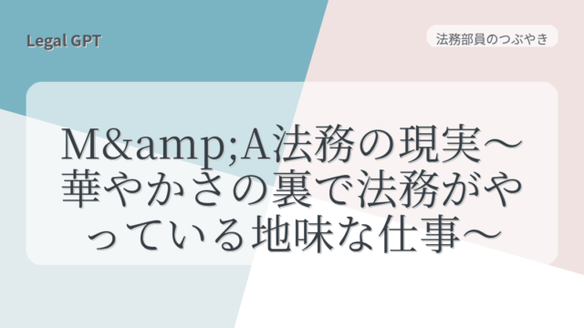 法務部員のつぶやき M&A法務の現実〜華やかさの裏で法務がやっている地味な仕事〜 2025年9月4日 fujita_admin https://legal-gpt.com/wp-content/uploads/2025/06/9cfed54331b16c43d320b81fc65f5b29.png Legal GPT