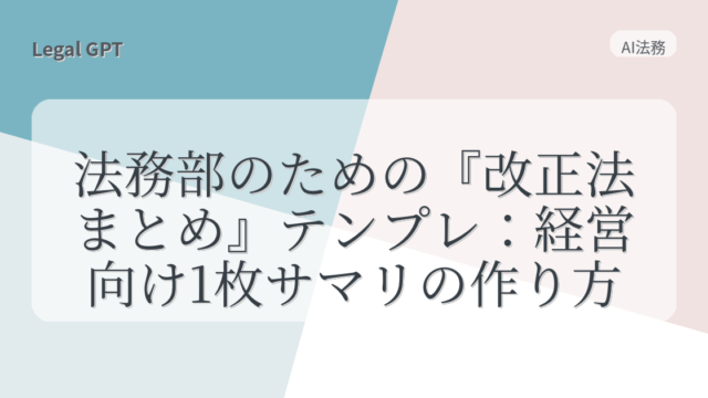 AI法務 法務部のための『改正法まとめ』テンプレ:経営向け1枚サマリの作り方 2025年9月9日 fujita_admin https://legal-gpt.com/wp-content/uploads/2025/06/9cfed54331b16c43d320b81fc65f5b29.png Legal GPT