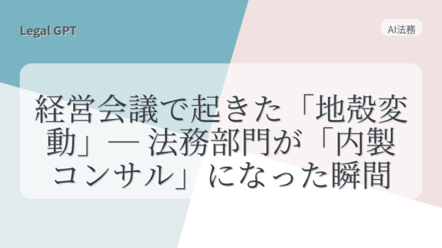 AI法務 経営会議で起きた「地殻変動」─ 法務部門が「内製コンサル」になった瞬間 2025年9月1日 fujita_admin https://legal-gpt.com/wp-content/uploads/2025/06/9cfed54331b16c43d320b81fc65f5b29.png Legal GPT