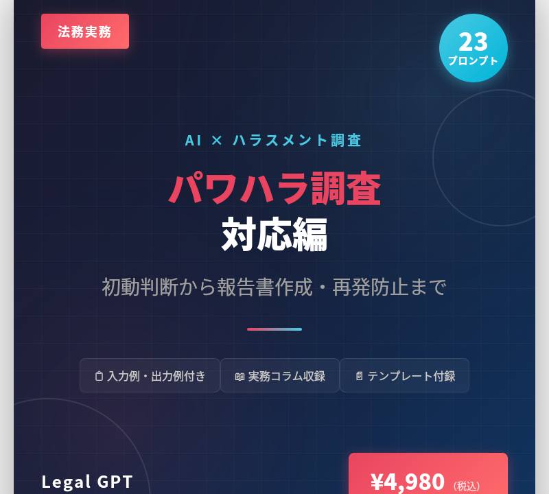 本書は弁護士による法的助言の代わりにはなりません。AIの出力は「たたき台」であり、最終判断は必ず人間が行ってください。重大な事案や訴訟リスクの高い事案では、弁護士への相談を強くお勧めします。