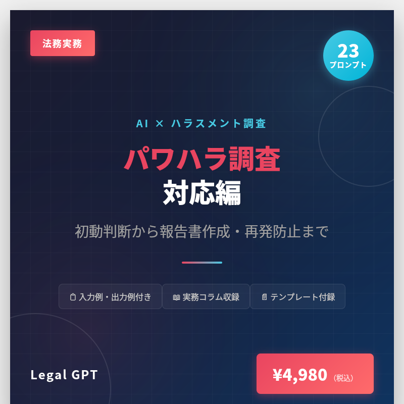 🆕 NEW RELEASE 法務実務プロンプト集23選セクハラ調査対応編 初動判断から報告書作成・再発防止まで二次被害を防ぎながら、適切な調査を進める 📋 入力例・出力例付き 📖 実務コラム収録 📄 付録11点収録 セク