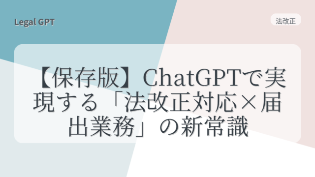 法改正 【保存版】ChatGPTで実現する「法改正対応×届出業務」の新常識 2025年8月8日 fujita_admin https://legal-gpt.com/wp-content/uploads/2025/06/9cfed54331b16c43d320b81fc65f5b29.png Legal GPT