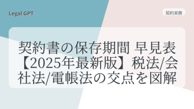契約実務 契約書の保存期間 早見表【2025年最新版】税法/会社法/電帳法の交点を図解 2025年10月23日 fujita_admin https://legal-gpt.com/wp-content/uploads/2025/06/9cfed54331b16c43d320b81fc65f5b29.png Legal GPT