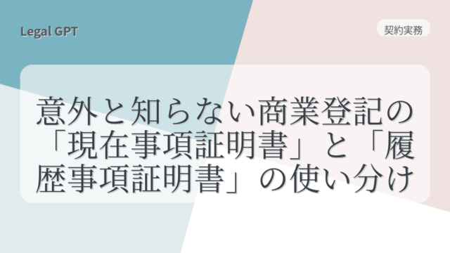 契約実務 意外と知らない商業登記の「現在事項証明書」と「履歴事項証明書」の使い分け 2025年7月22日 fujita_admin https://legal-gpt.com/wp-content/uploads/2025/06/9cfed54331b16c43d320b81fc65f5b29.png Legal GPT